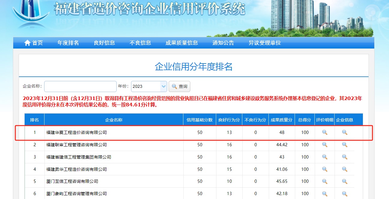 2023年福建省企业信用评价年度排名第一名