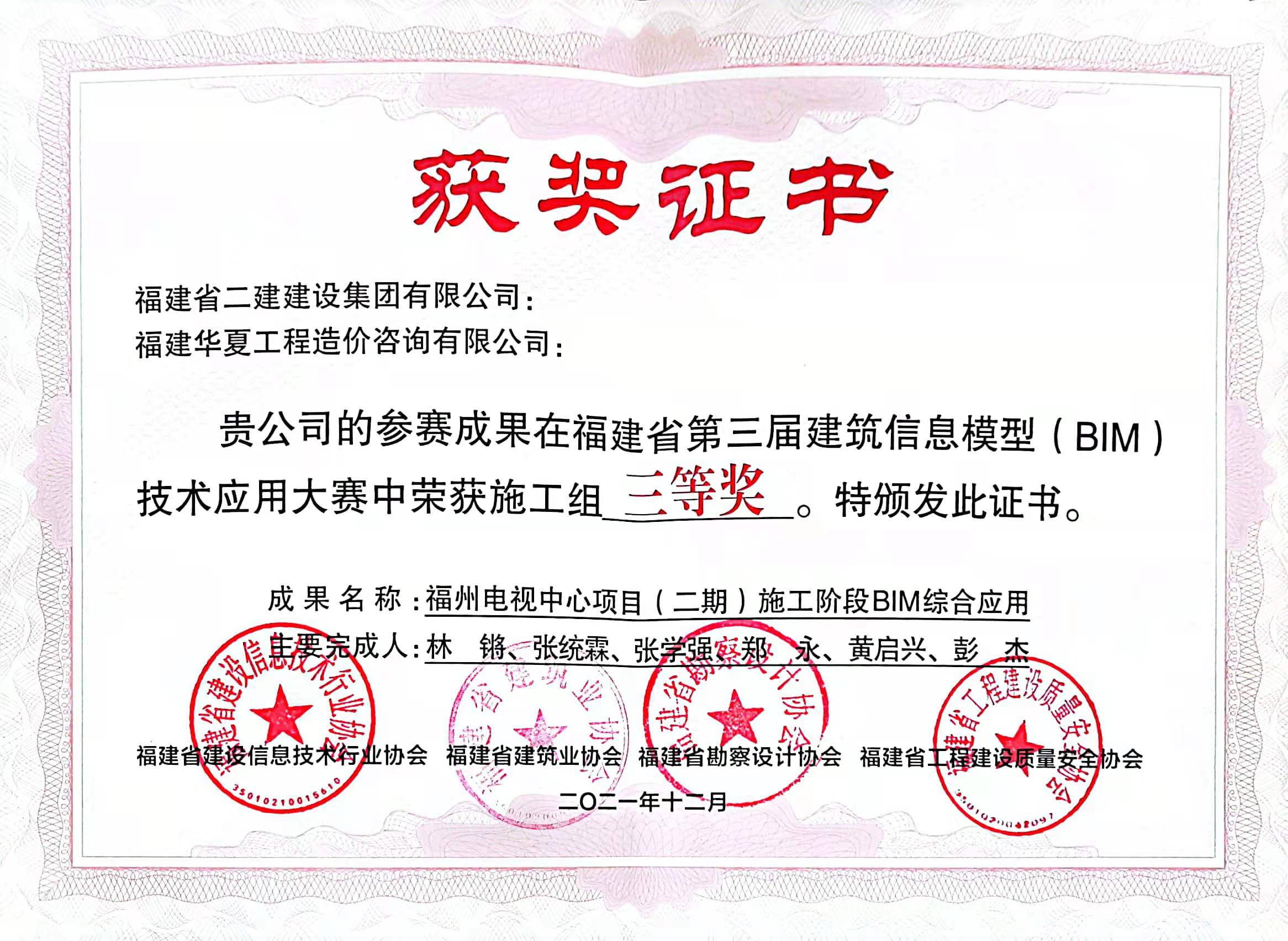 福建省第三届建筑信息模型(BIM)技术应用大赛中施工组三等奖