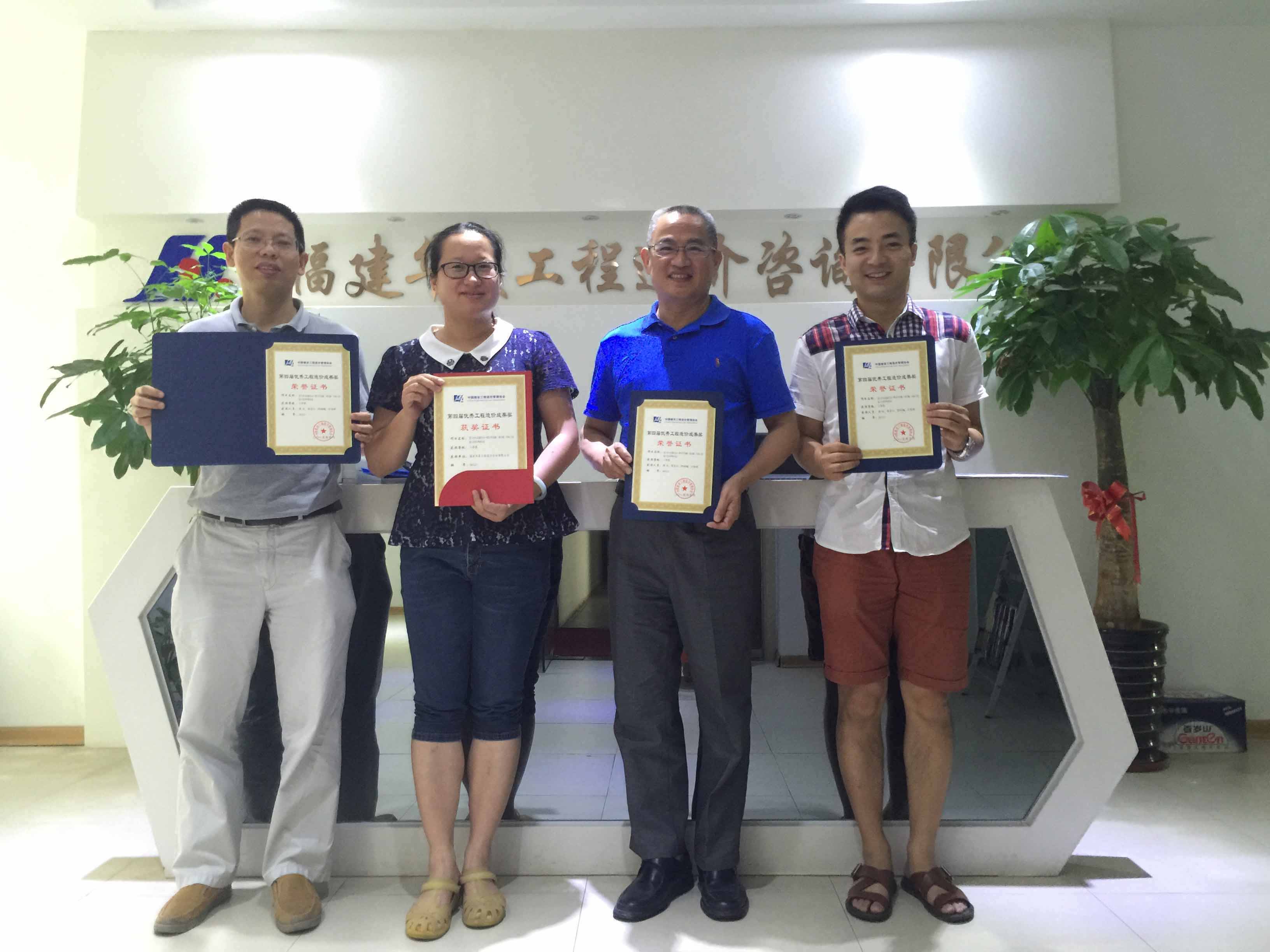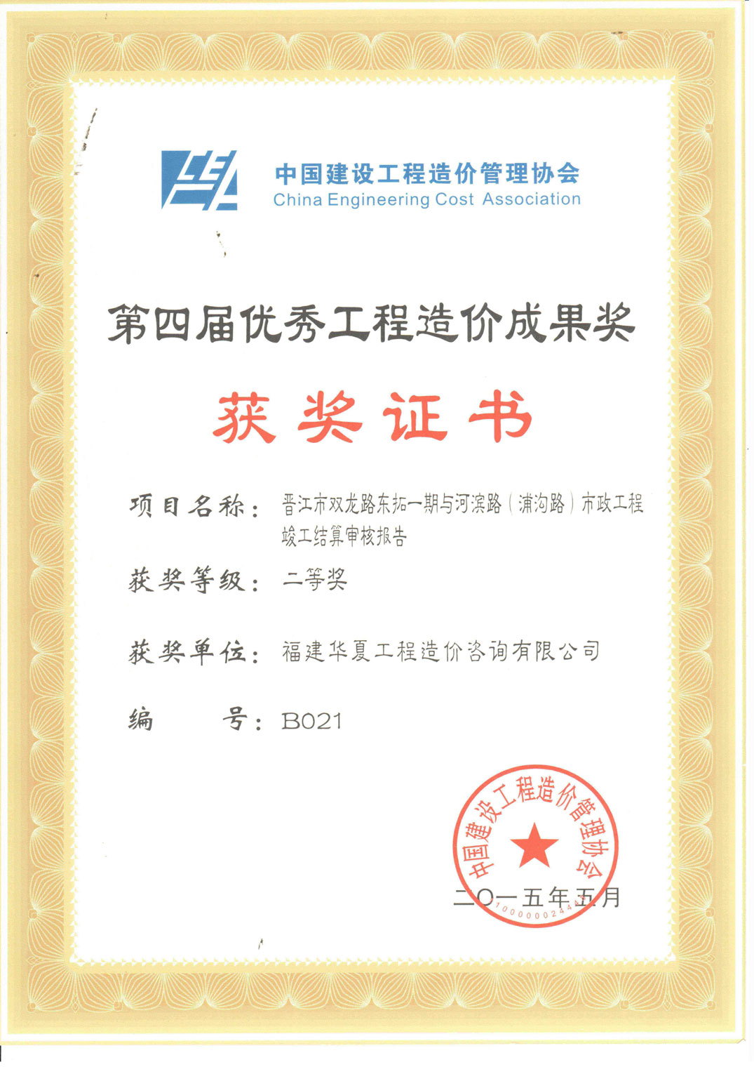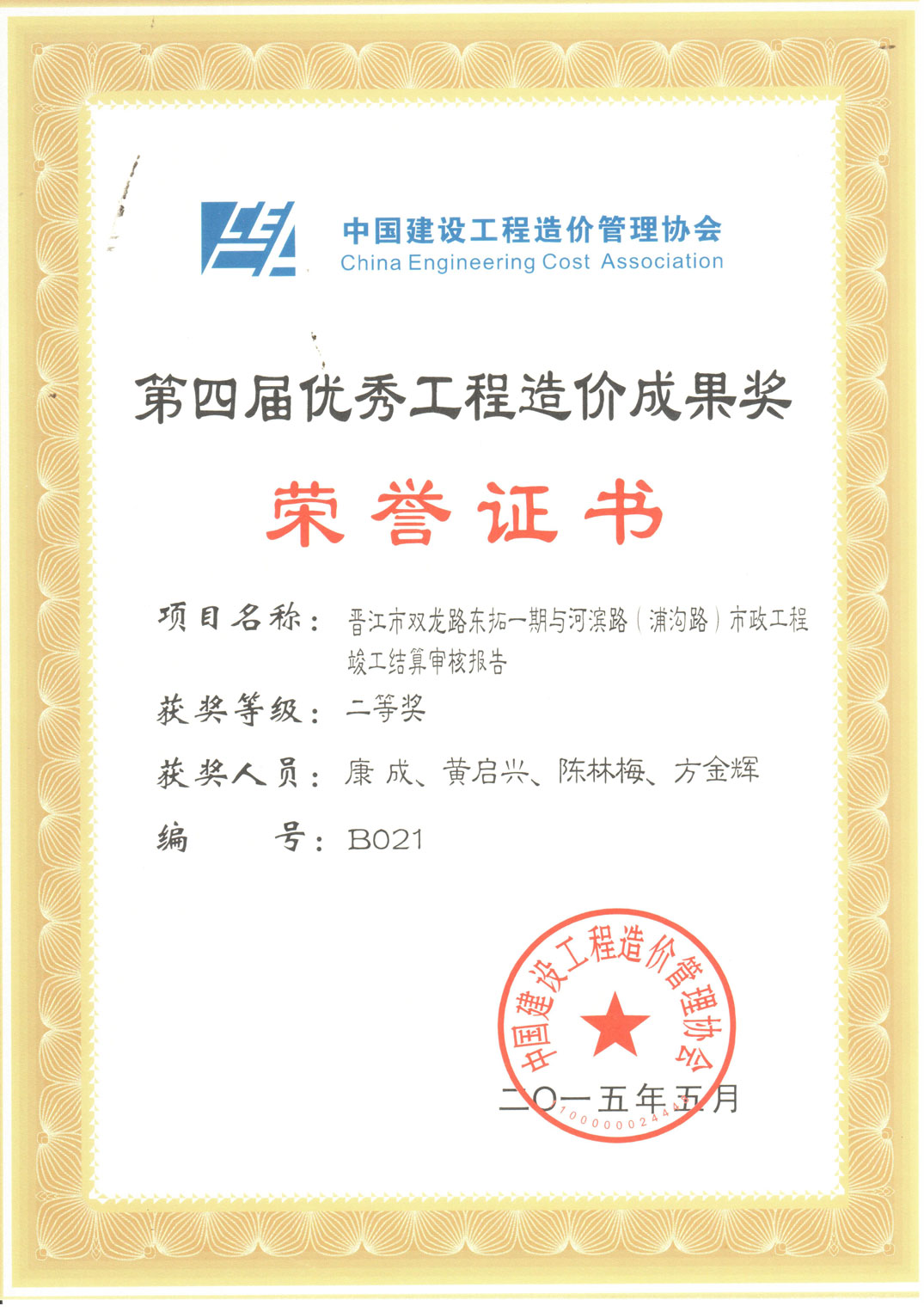 《晋江市双龙路东拓一期与河滨路(浦沟路)工程(BT项目)》荣获中价协第四届优秀工程造价成果奖二等奖以及参与项目获奖人员:黄启兴、方金辉、陈林梅、康成