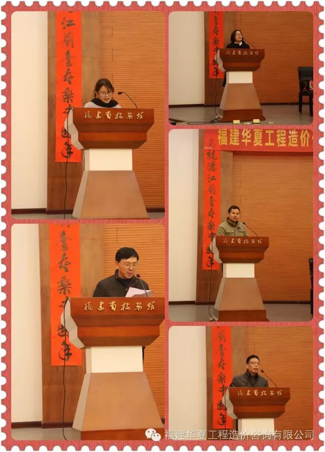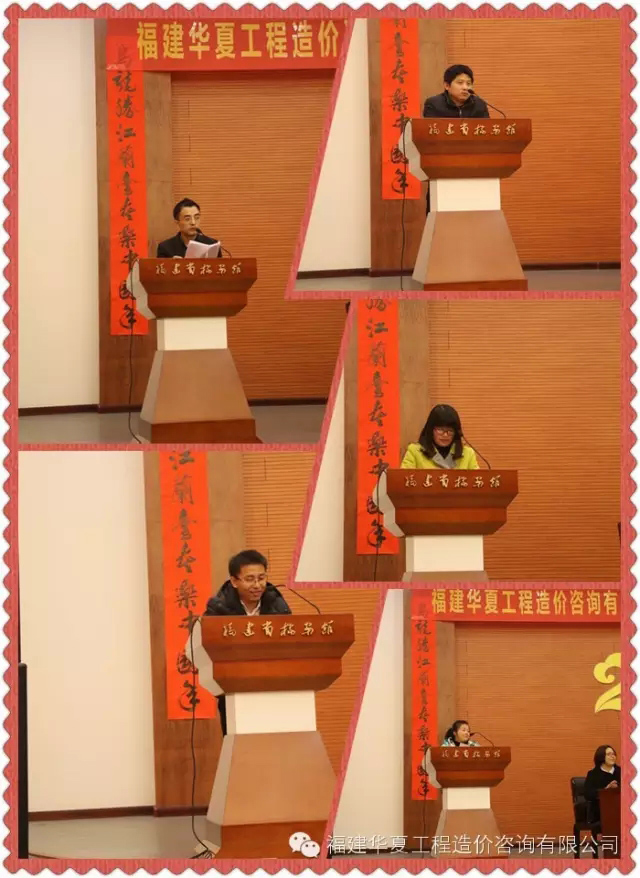 公司副总工李知冲、袁爱丽、造价部一科科长郑小熙、二科科长李淑芬、三科科长王国勇、市政路桥部科长康成、代建部经理黄伟志、代理部经理王誌庆、综合部主任林笑容都陆续发表讲话,他们对2015年做了详细的总结,以及对2016年都表达了美好的祝愿。